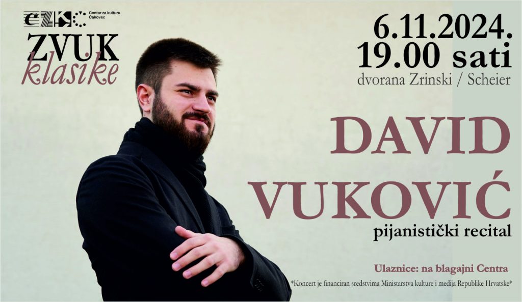 Ciklus „Zvuk klasike“ nastavljamo i u studenome. U srijedu 6. 11. u Dvorani Zrinski / Scheier koncert će nam prirediti David Vuković. Ovaj rođeni Čakovčanin diplomirani je pijanist koji svira od svoje desete godine. Svoje glazbeno obrazovanje započeo je u Umjetničkoj školi „Miroslav Magdalenić“ u klasi prof. Daniela Marija Novaka, nastavio u Glazbenoj školi u Varaždinu gdje mu je profesorica bila Lea Šantek i na Muzičkoj akademiji u Zagrebu gdje je diplomirao u klasi profesora Đorđa Stanettija. Dobitnik je niza nagrada na pijanističkim natjecanjima i natjecanjima za komorne sastave, a može se pohvaliti i mnogim zapaženim nastupima uz Zagrebačku filharmoniju, Zagrebačke soliste, Tamburaški orkestar Hrvatske radiotelevizije, Varaždinski komorni orkestar te na manifestacijama kao što su Dubrovačke ljetne igre i Muzički biennale Zagreb. Domaćoj publici predstavit će se s djelima Bacha, Slavenskog i Brahmsa, dok će mu za intermezza poslužiti kombinacije korala.